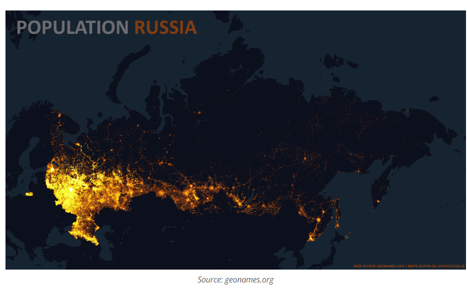 רוסיה מצידה המזרחי מוגנת על ידי שרשרת רכסי הרי אורל והשטח העצום והקפוא של סיביר. זאת אומרת, אין מפקד צבאי מספיק משוגע שינסה לכבוש אותה מסיביר. האזור עצום, קפוא, הררי ללא דרכים לנוע בהן כמעט, וללא תושבים ותשתיות. שטח עצום מאוד מאוד ושומם מאוד מאוד. מצידה המערבי של רוסיה הסיפור הוא אחר, מפני שלרוסיה יש שליטה מהיבשת האירופאית ועד סוף העולם במזרח אסיה, המנהיגות הרוסית מתבוננת על כל העולם, ואולי הערים החשובות של הרוסים ממוקמות באירופה, אבל הרוסים לא רואים את עצמם חלק מאירופה כי הם..ובכן…רוסים.